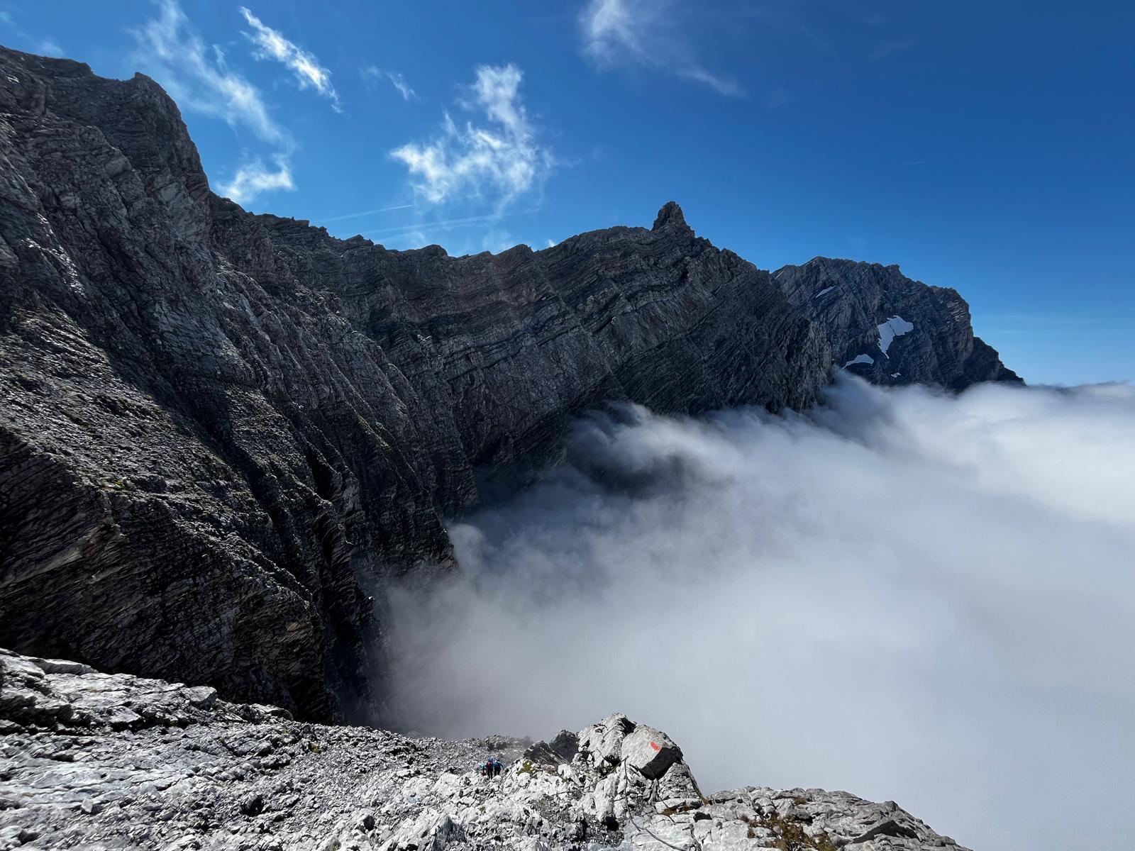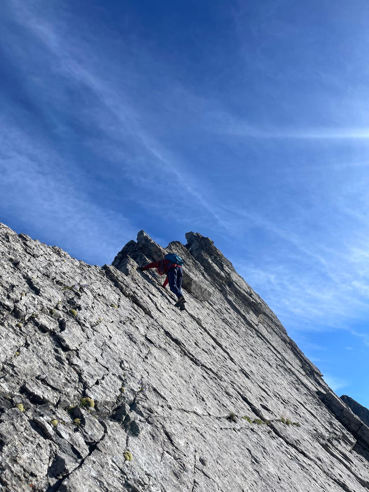 Le lendemain, nous nous engageons sur l’arête Vierge. Crampons et piolet accompagnent la progression sur un terrain varié, alternant passages rocheux, sections effilées et courts passages d’escalade. Le calcaire clair offre une excellente adhérence et renforce le caractère esthétique de l’itinéraire.